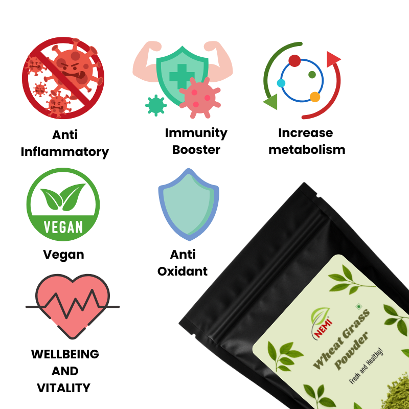 Nemi Wheat Grass Powder is a 100% natural, Nutrient-rich superfood made from tender young wheatgrass shoots. Packed with chlorophyll, vitamins, minerals, and antioxidants, it supports daily wellness, boosts energy, and aids natural detoxification. Ideal for a clean, green lifestyle.Β